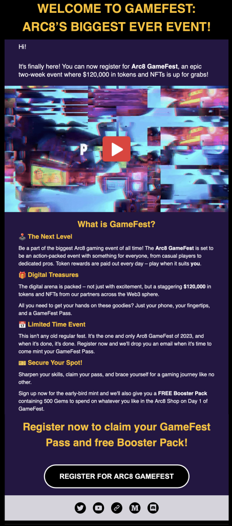 The subject (the outcome of an A/B test) was “Arc8 GameFest | Your Invitation to Play for $120,000 in Tokens and NFTs“. It was sent to tens of thousands of registered Arc8 players, many of whom had yet to receive an email from GAMEE outside of their automated welcome email.